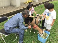 9月25日(木)に、1年生が待ちに待っていたヤギさんが学校へやってきました。三和区のグリーンファームシティの澤田さんが連れてきてくださいました。
