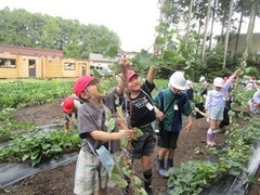 サツマイモは、葉っぱとツルがとても増えていて、足の踏み場もないところもありました。ツルを持ち上げて長さを調べたり、「もうサツマイモができているのかな?掘ってみたいな!」と話したりしている中、ある児童が「サツマイモができてる!」と大きな声をあげました。よく見ると、地面からモッコリと、サツマイモが顔を出していたのです!収穫への期待が一気に高まったピースっ子たちでした。