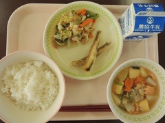 今日の給食は、発酵食品の醤油と塩麹を使った献立にしたそうです。上越の気候と食べものの関係について考えながら、給食を味わっていただきました。