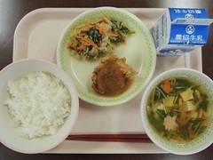 今日は「和食の日」にちなんで、和食の良さを生かした給食でした。鶏肉の唐揚げには、旬の大根で作ったおろしポン酢ソースがかけられていました。すまし汁はかつお節でだしをしっかりとったそうです。また、主食はご飯で、栄養バランスが良い献立にしたそうです。