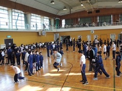 11月21日(金)に、スポーツ委員会主催のふれあい班大縄大会が行われました。ふれあい班(縦割り班)二班を1チームとして、3分間の8の字跳びの回跳で競いました。