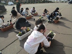 11月27日(木)の昼休みに、来年最高学年となる5年生が、毎年この時期に行っている花植え作業を行いました。一人一つのプランターにパンジーとビオラの苗を2株ずつ植えました。