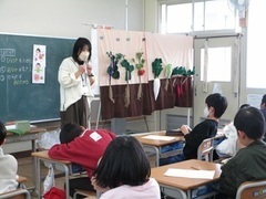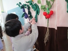 12月4日(木)に、2年生が栄養教諭から、冬野菜について教えていただきました。子どもたちは、夏野菜と冬野菜のタペストリーを見たり、収穫した時のことを思い出したりしながら、「冬野菜は白っぽい物が多いね。」「冬野菜は土の近くに実がなるね。」「夏野菜は一つの苗からたくさんの実が収穫できるけれど、冬野菜は1つしか実をつけないよ。」などと、たくさんのことに気づきました。