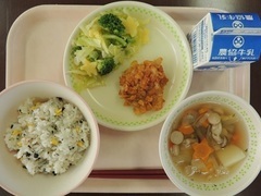 クリスマス料理と言えば、チキンを思い浮かべる人が多いと思います。今日は、鶏肉にコーンフレークをまぶして焼いた「鶏肉のコーンフレーク焼き」が出ました。また、もみの木をイメージしたサラダも出ました。