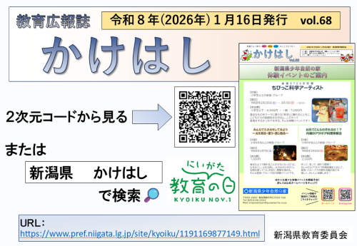 新潟県教育委員会から、教育広報誌「かけはし」68号が発行されました。インターネット上で閲覧できます。QRコードからご覧いただくか、「新潟県 かけはし」で検索してご覧ください。