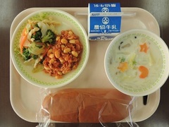 今日の減塩ポイントは「パンに含まれる塩分を考慮した減塩」でした。今日の主食であるパンには塩が入っているそうです。ほぼ全てのパンに塩は含まれているそうで、塩はパンの食感やふくらみ方に関係しているそうです。パンの日は、ご飯と比べて塩を取る量が増えるため、塩分の取りすぎを防ぐために、給食では味付けに酢を使ったり、トマトや牛乳などのうまみを使った汁物にするなど塩分を抑える工夫をしているそうです。