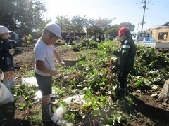 初めに、わさわさと茂ったツルを「おおきなかぶ」のお話の要領でみんなで引っ張り、抜いては運び、抜いては運びを繰り返しました。